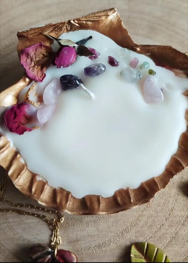 Cire de soja coulée dans une magnifique coquille Saint-Jacques véritable et décorée de pierres naturelles de quartz rose, améthyste et fluorite arc en ciel.